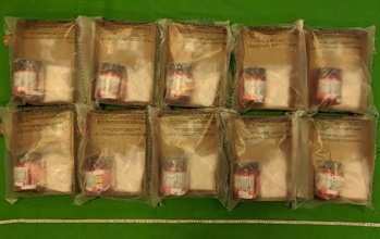 Customs officers inspected an air parcel that had arrived in Hong Kong from Malaysia, declared as carrying protein isolate, at HKIA on June 29 and found the batch of suspected heroin concealed inside ten plastic bottles. After follow-up investigation, Customs officers yesterday (August 7) arrested a 26-year-old man suspected to be in connection with the case in Kwai Chung.