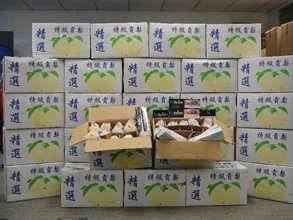 At about 9.20pm yesterday, Customs officers at Man Kam To Control Point intercepted a vehicle loaded with goods which declared to contain "fresh fruit". Upon x-ray examination, 450,000 sticks of duty-not-paid cigarettes were found concealed inside 106 cartons of fresh fruit. The driver was arrested immediately.
