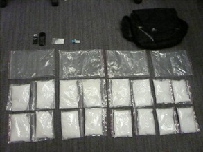 Today at around 10.30am, Customs Officers intercepted a suspicious man for inspection at the Customs Arrival Hall of Lok Ma Chau Control Point, and found over 4 kilogrammes of suspected ketamine inside the shoulder bag and left front pocket of the trousers of the said man.