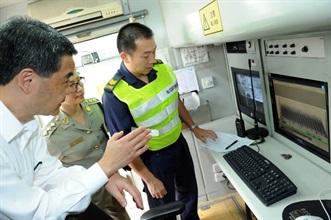 Accompanied by the Commissioner of Customs and Excise, Mr Clement Cheung, the Chief Executive saw for himself the process of cargo examination and the use of the mobile x-ray vehicle scanning system to detect contraband.