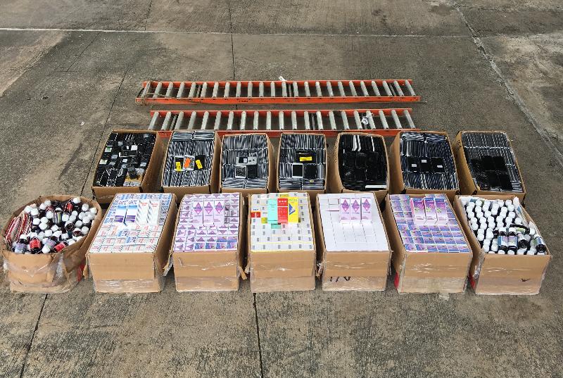 Customs officers and Marine Police mounted an anti-smuggling operation at Chek Lap Kok early this morning. Officers spotted some suspicious persons loading goods onto two speedboats at the seashore of the southern part of Chek Lap Kok. During enforcement action, those persons jumped onto the speedboats and fled. Seven cartons of cough syrup and seven cartons of used mobile phones were seized. A seven-seater private car was detained at scene. No one was arrested. The case is still under investigation.