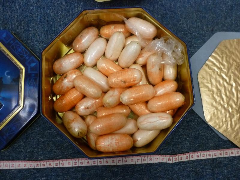 The arrested man arrived at Hong Kong from Düsseldorf, Germany via Dubai this morning. During customs clearance, Customs officers found 3 candy boxes in his hand carry baggage. X-ray check revealed suspicious images on the candy boxes. In-depth examination led to the discovery of 55 pellets of suspected cocaine with a total weight of about 1.2 kilograms.