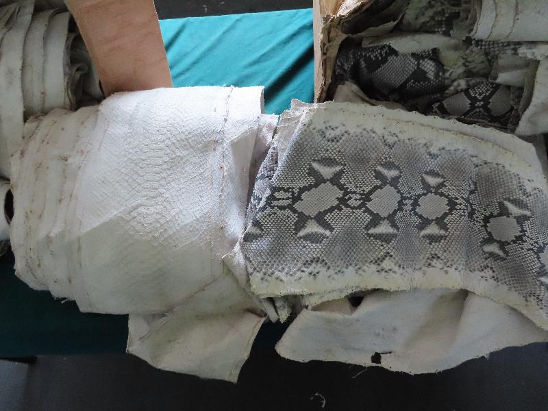 Through intelligence analysis and risk assessment, Customs officers at Lok Ma Chau Control Point on that day selected and inspected an inbound consignment, which arrived in Hong Kong from Indonesia via Shenzhen, declared as cloth. The batch of suspected smuggled snake skin was found inside the consignment.