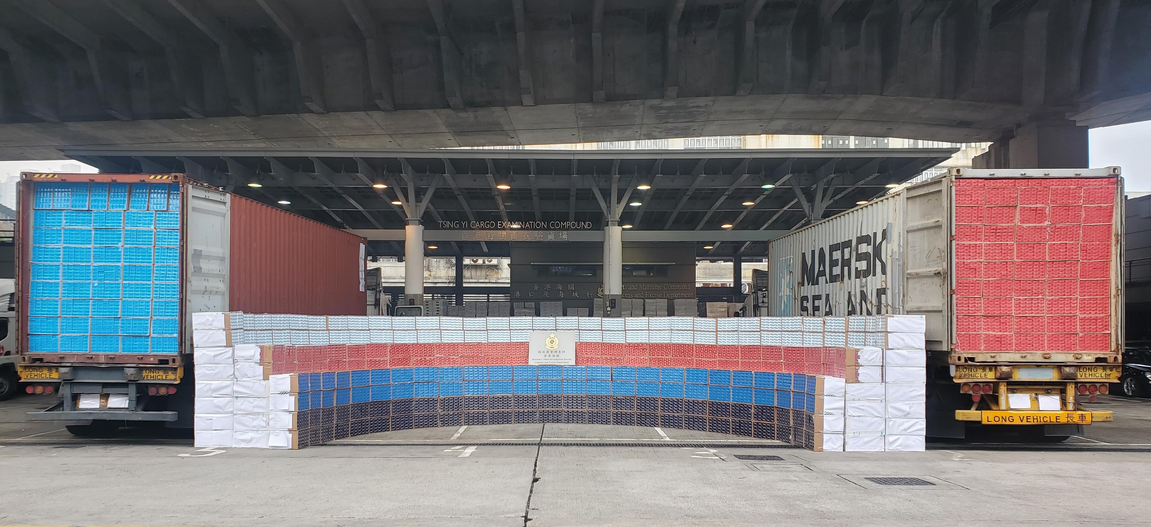 During an anti-illicit cigarette operation conducted in San Tin, Yuen Long, yesterday afternoon, Customs officers seized the batch of suspected illicit cigarettes from two 40-foot containers at a container yard. Two men, aged 63 and 69, suspected to be connected to the case were arrested.