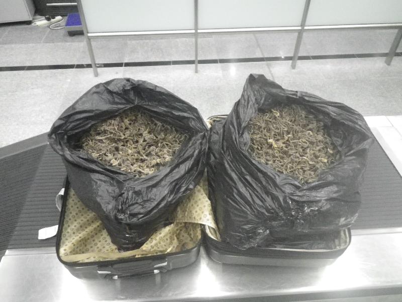 Customs officers conducted Customs clearance on one male passenger at the airport last evening. The male passenger arrived Hong Kong from Cairo, Egypt via Bangkok, Thailand. During the clearance, Customs officers found about 14 kg of suspected dried seahorses from the male passenger’s checked-in baggage. The case was handed over to the Agriculture, Fisheries and Conservation Department for follow-up investigation.