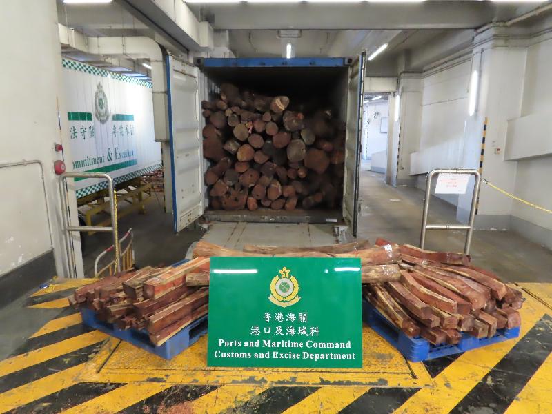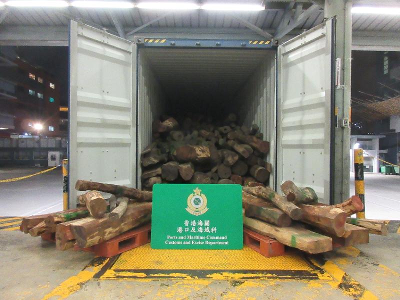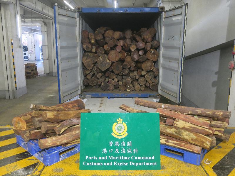 Hong Kong Customs detected three smuggling cases involving scheduled wood logs at the Kwai Chung Customhouse Cargo Examination Compound between October 21 and today (November 9). A total of about 34 tonnes of suspected scheduled wood logs of endangered species, with an estimated market value of about $1.1 million in total, were seized.
