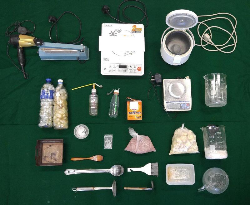 During an anti-narcotics operation early this morning, Customs officers intercepted a man at Western District. Upon search of his reported premises, suspected drug manufacturing tools and about 670 grammes of suspected crack cocaine were found.