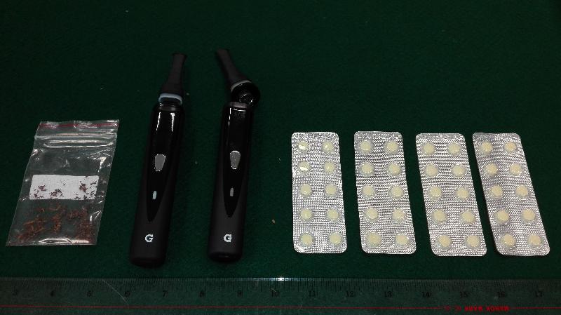 Last night, Customs officers intercepted an incoming passenger at Lok Ma Chau Spur Line Control Point and found cannabis concealed inside some tea leaf packets from a handbag carried by the arrested person. Later on, Customs officers escorted the arrested man for premises search in To Kwa Wan. Small amount of suspected cannabis, two inhaling apparatus for smoking cannabis and 40 tablets of suspected diazepam were further seized. The market value of the drug seized was about $153,000 in total.