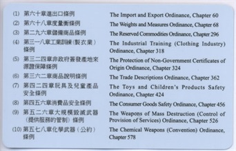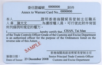 To distinguish the identity between Trade Controls Officers and the Service Officers of the department, the new card for the Trade Controls Officers is greyish blue in colour. Besides, there is an Annex to the new card which serves to certify that the card holder is an authorised officer for the purpose of the Ordinances listed thereon.