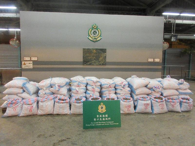 Hong Kong Customs yesterday (July 28) seized about 2 100 kilograms (kg) of suspected pangolin scales from a container at the Kwai Chung Customhouse Cargo Examination Compound. The total value of the seizure was about $4.8 million.