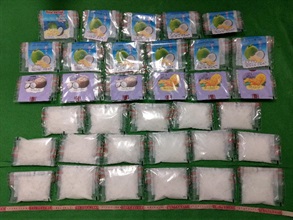 A male passenger arrived in Hong Kong from Bangkok, Thailand yesterday afternoon. During Customs clearance, Customs officers found 17 packets of suspected ketamine wrapped as snacks in his luggage. The man was then arrested.