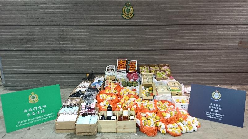 Hong Kong Customs and the Marine Police today (March 4) conducted an anti-smuggling joint-operation and detected two suspected smuggling cases using fishing vessels in the waters of Lau Fau Shan. A large batch of suspected smuggled goods including vehicle parts, cosmetics, wines and fruits with an estimated market value of about $550,000 were seized.