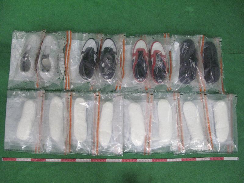 Four male passengers arrived in Hong Kong from Bangkok, Thailand, in the morning on March 6. Customs officers intercepted them for examination and found a total of eight packets of suspected heroin concealed inside the false compartments of the shoes worn by them. They were then arrested.