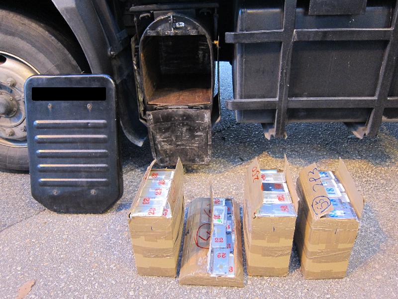 Customs officers intercepted three outbound container trucks at Man Kam To Control Point yesterday afternoon. Upon examination, batches of mobile phones were found in false compartments inside the three container trucks. Later, Customs officers searched a cargo yard in Yuen Long and a domestic premises in Sheung Shui where more mobile phones and a bulk of packing tools and materials were seized. Later, an inbound container truck which was suspected to be involved in this case was detained at Sha Tau Kok Control Point for investigation.