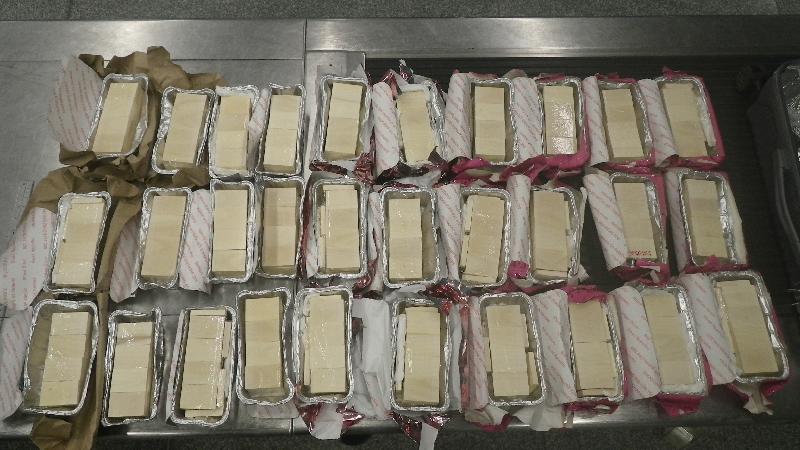 Customs officers intercepted a 43-year-old male passenger at the airport this afternoon. The man arrived in Hong Kong from Kinshasa, Democratic Republic of the Congo, via Addis Ababa, Ethiopia. During Customs clearance, a total of about 26 kg of suspected worked ivory were found concealed in 30 tin foil boxes inside his check-in baggage.
