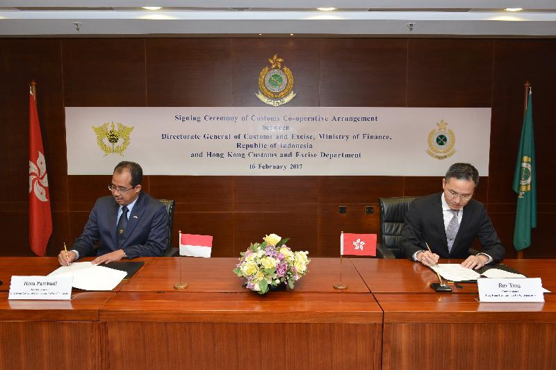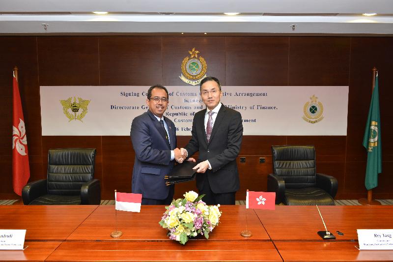 Hong Kong Customs signed a Customs Co-operative Arrangement (CCA) with the Directorate General of Customs and Excise of the Ministry of Finance of the Republic of Indonesia today (February 16) at the Customs Headquarters Building in Hong Kong.