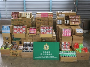 Through risk assessment, Customs officers inspected a 20-foot container declared to contain cosmetic cotton arriving in Hong Kong from Japan. After inspection, Customs officers found the assorted goods, including suspected pesticides, suspected pharmaceutical products, personal care products, health foods and drinks and sport shoes, in the container. Investigation is ongoing.