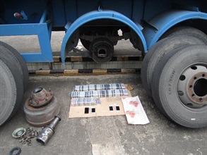 Customs officers intercepted an outgoing container truck at Man Kam To Control Point for inspection this morning and seized 736 used smartphones inside the altered axles of the trailer. The 59-year-old male driver was arrested. Investigation is ongoing.