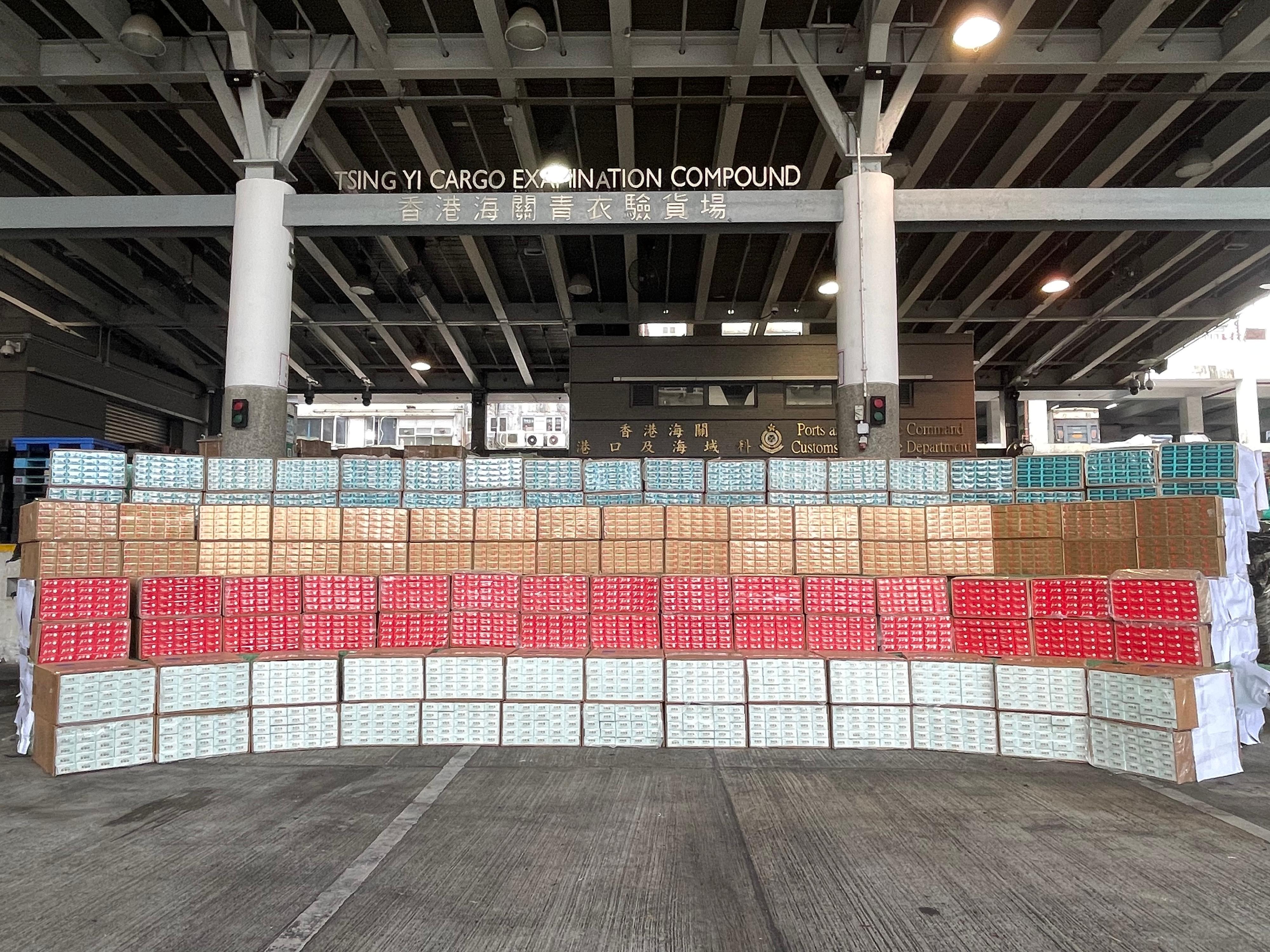 Hong Kong Customs yesterday (May 21) and today (May 22) raided three suspected illicit cigarette storehouses in Chai Wan and Ap Lei Chau. A total of about 28 million suspected illicit cigarettes with an estimated market value of about $77 million and a duty potential of about $53 million were seized, making it the largest illicit cigarette storage case detected by Customs in the past 21 years.