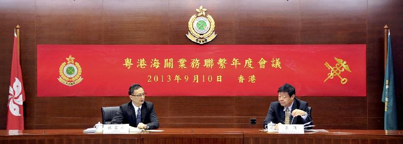 The 2013 Annual Review Meeting between Hong Kong and Guangdong Customs was held in Hong Kong today (September 10). The Hong Kong Customs delegation was headed by the Commissioner of Customs and Excise, Mr Clement Cheung, while the Guangdong Customs delegation was headed by the Vice Minister of the General Administration of Customs and the Director General of the Guangdong Sub-Administration of the General Administration of Customs of the People's Republic of China, Mr Lu Bin.