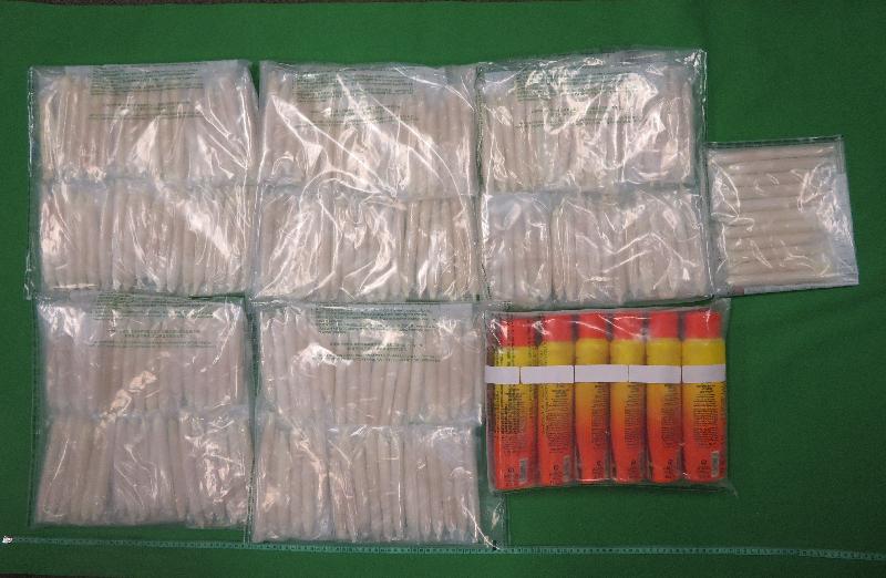 Customs officers on September 7 inspected an air consignment that had arrived in Hong Kong from the Netherlands via Italy and found about 3.7kg of suspected ketamine concealed inside the false compartments of three carton boxes. Upon follow-up investigation, Customs officers yesterday arrested a 27-year-old man and a 28-year-old man suspected to be connected with the case in Kwai Chung.
