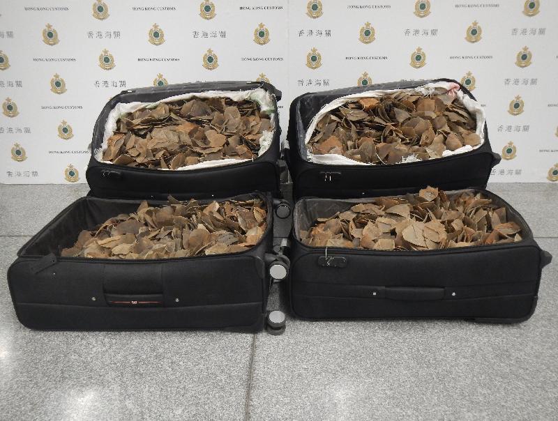 Hong Kong Customs today (July 17) seized a total of about 100 kilograms of suspected pangolin scales with an estimated market value of about $500,000 at Hong Kong International Airport.