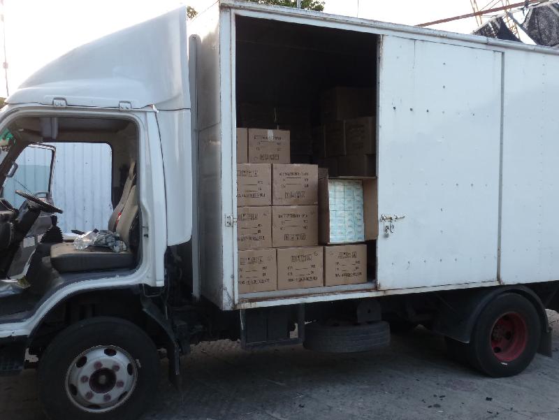 Customs officers conducted an anti-illicit cigarette operation in Fanling yesterday afternoon and found the batch of suspected illicit cigarettes on board a truck at a cargo yard.
