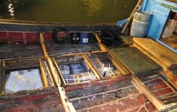 Acting on information, Customs at about 6.30pm detected a suspicious local fishing vessel at the Shau Kei Wan Typhoon Shelter with some males loading goods in the catch-hold on board the vessel. Soon afterwards, the vessel departed from the Shau Kei Wan Typhoon Shelter and set sailed towards Hong Kong southeast waters.