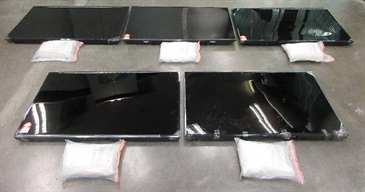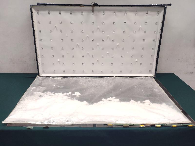 Customs officers yesterday inspected two air express parcels from Malaysia transshipping to Japan through Hong Kong. About 28.6kg of suspected methamphetamine were found concealed inside five LED television sets. This is the largest methamphetamine seizure from the air cargo channel in the past three years.