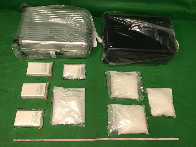 Also, a 27-year-old male passenger and a 26-year-old female passenger arrived in Hong Kong from Brussels, Belgium on the same flight yesterday. Customs officers inspected their checked-in baggage and found a total of about 10.3kg of suspected ketamine and about 3.2kg of suspected cocaine concealed inside false compartments. They were then arrested.