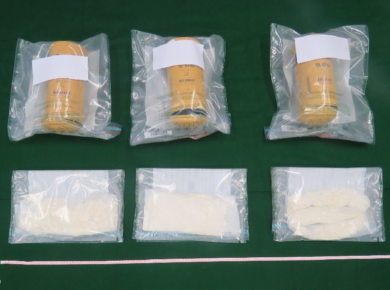 Customs officers at Lok Ma Chau Control Point on that day intercepted an express parcel, which arrived in Hong Kong from Africa via Shenzhen, declared as containing oil filters. Upon inspection, the batch of suspected cocaine was found concealed inside three metal oil filters.