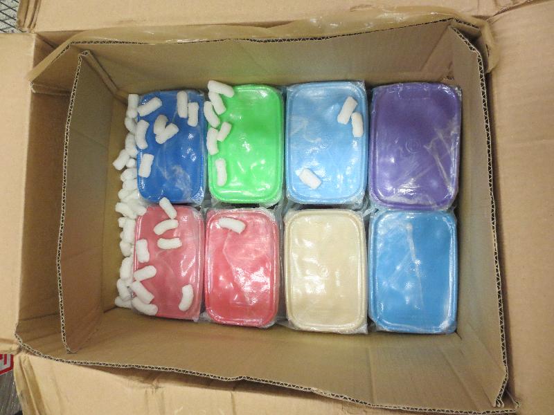 Acting on an intelligence exchange with overseas counterparts, Customs officers inspected an air consignment arriving in Hong Kong from Mexico via the United States on December 5. From three cartons of goods declared as plastic resin, the batch of suspected methamphetamine was found concealed inside 120 plastic boxes wrapped by plastic wrap and vacuum bags, and placed under a batch of plastic resin as a cover.