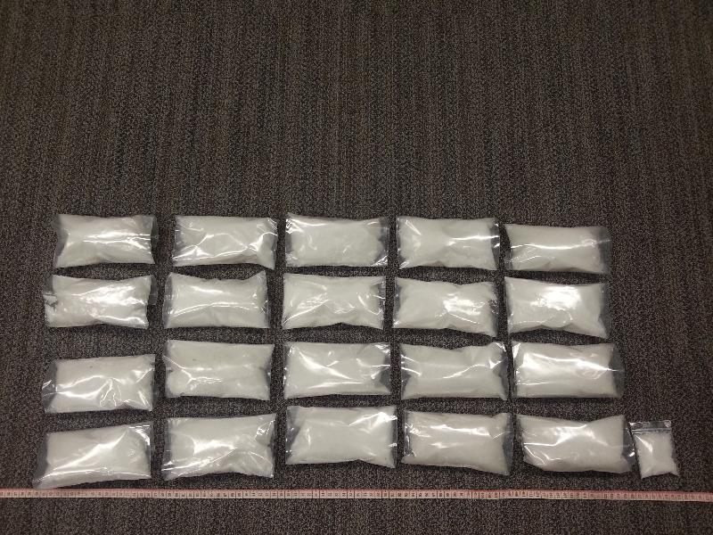 Hong Kong Customs yesterday (August 21) seized about 5 kilograms of suspected ketamine at Shenzhen Bay Control Point and arrested two males aged 16 and 20. After further investigation, another 23-year-old man was arrested. The market value of the drug was about $590,000.