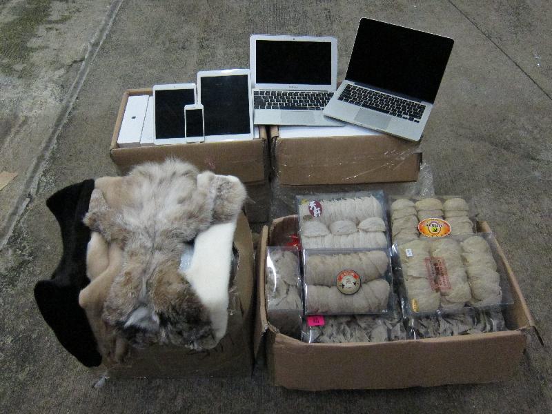 The goods seized in the operation included about 800 tablet and notebook computers, 200 high-end mobile phones, 250 kilogrammes of edible bird's nests, 550 kilogrammes of fur and other assorted goods. The total estimated value is more than $8 million. Four men and one woman, aged from 20 to 44, were arrested. Investigation is continuing.