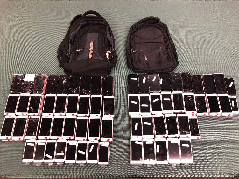 Customs officers intercepted an outgoing tourist coach at Lok Ma Chau Control Point yesterday evening and seized 312 smartphones in two rucksacks on board the vehicle.