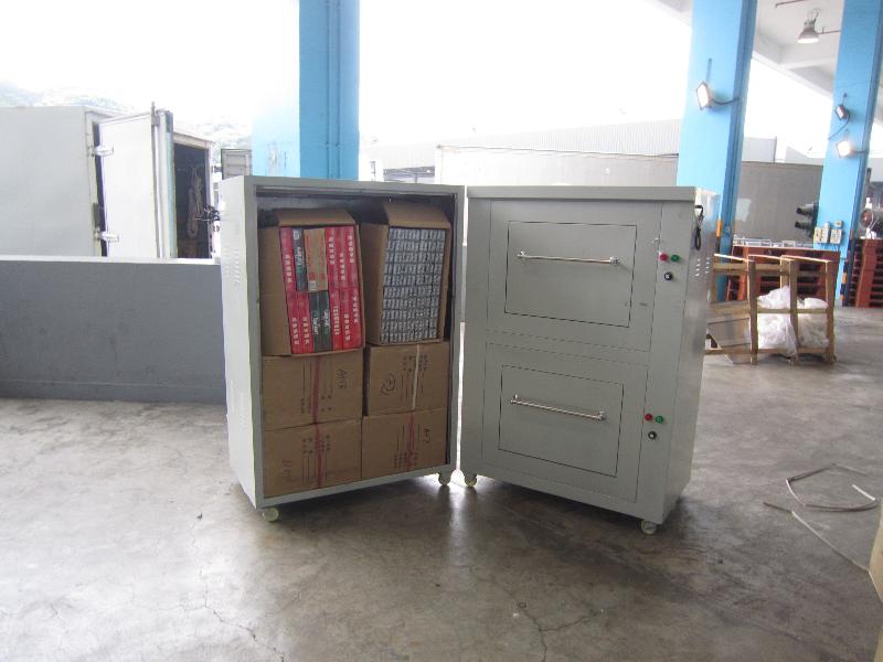Hong Kong Customs today (July 8) detected a suspected case of using fake bakery ovens to conceal illicit cigarettes at Man Kam To Control Point. About 1 million sticks of illicit cigarettes were seized from a cross-boundary lorry. The total market value of the cigarettes was about $2.7 million with a duty potential of about $1.9 million. In the operation, a 27-year-old male lorry driver was arrested and the lorry used for smuggling illicit cigarettes was detained for investigation.