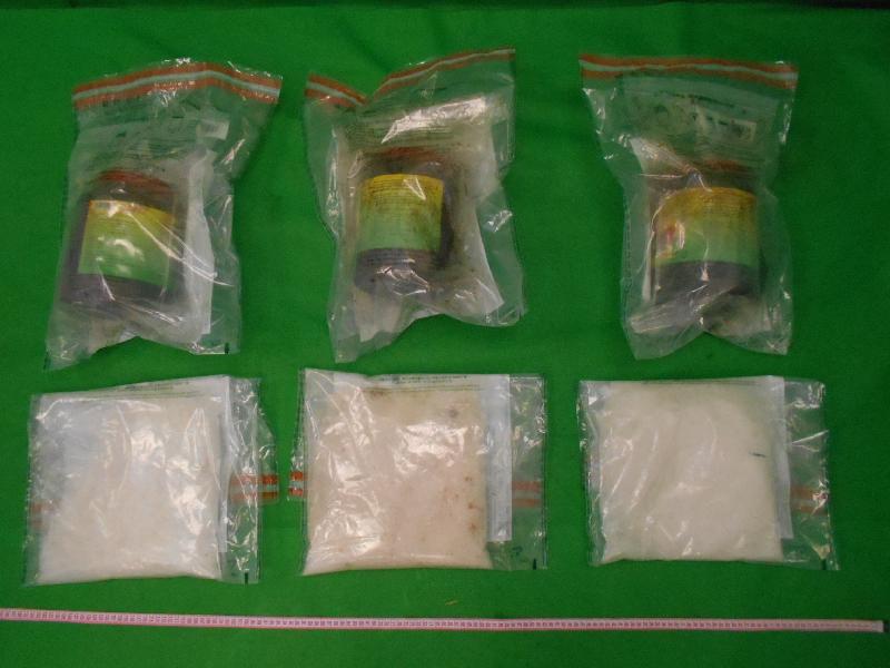 Hong Kong Customs yesterday (April 3) seized about 5 kilograms of suspected methamphetamine with an estimated market value of about $2.8 million at Hong Kong International Airport.