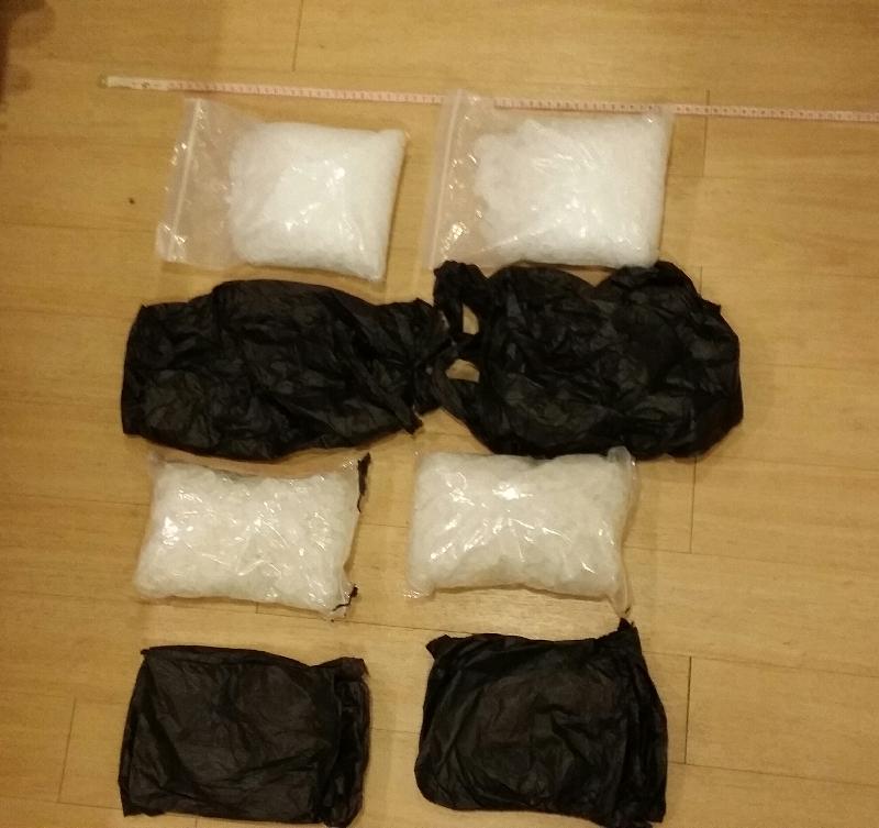 Customs officers intercepted a woman arriving from Shenzhen for personal search at Lo Wu Control Point last night. Two packets of suspected methamphetamine, weighing about two kilogrammes in total, were found in a bag carried by her. The woman was arrested at the scene. Upon follow-up investigation, officers of Customs Drug Investigation Bureau seized another two kilogrammes of suspected methamphetamine in Tai Po.