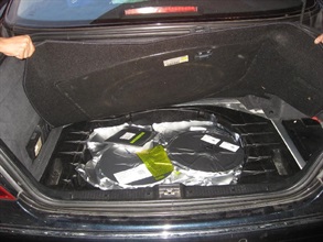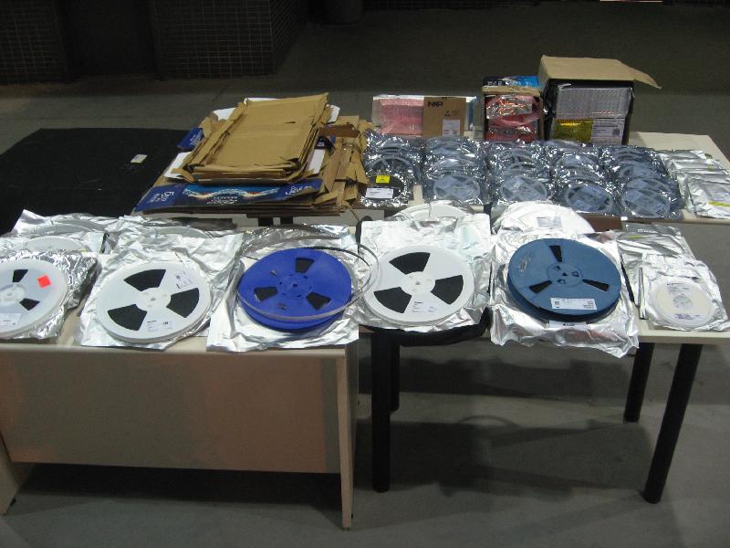 Customs officers intercepted an outbound private car during an anti-smuggling operation at Shenzhen Bay Control Point today. Upon inspection, 97 vacuum aluminum bags containing 286,000 integrated circuits, valued at about $1.71 million, were found being concealed in the spare tyre position of the vehicle boot which were covered by several boxes of distilled water and a carpet. The 32-year-old male driver was arrested for attempting to export unmanifested cargo. He was put on police bail pending follow-up investigation.