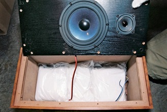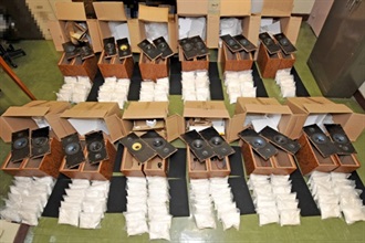 Customs Officers at Man Kam To Control Point found a consignment declared as "speakers" suspicious while conducting clearance on an incoming container truck on the morning of September 22. After a thorough examination, the drug was found concealed inside 23 out of the 120 speaker boxes. A male driver, aged 53, was arrested.