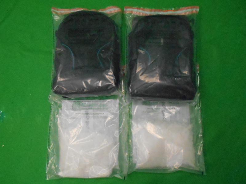 A female passenger arrived in Hong Kong from Siem Reap, Cambodia on May 24. Upon examination of her luggage, Customs officers found the suspected methamphetamine concealed inside the false compartment of two rucksacks placed in her luggage. The woman was then arrested.