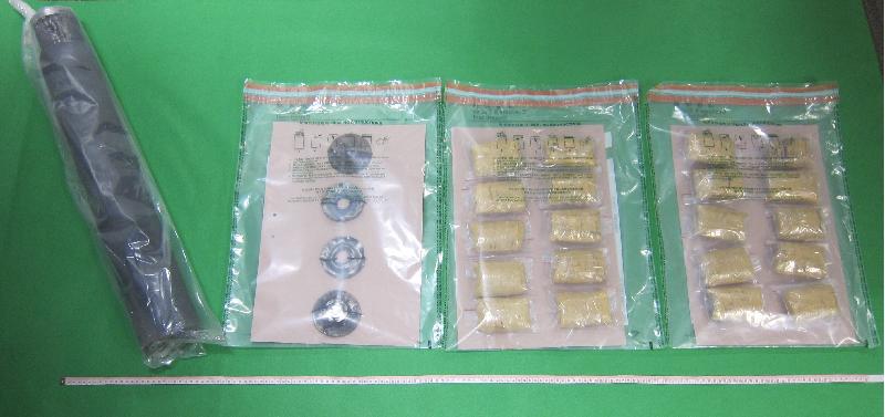 During an anti-narcotics operation conducted in Yuen Long yesterday night, Customs officers intercepted a man and inspected an express parcel he was carrying. An industrial metal roller was found with suspected methamphetamine concealed inside. The 42-year-old man was then arrested.