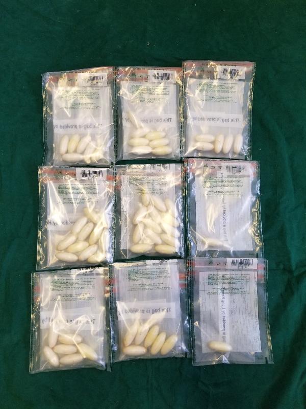 A 43-year-old male passenger arrived in Hong Kong from Cameroon via Addis Ababa, Ethiopia, on September 15. The man was found to be suspicious upon Customs clearance and was escorted to hospital for examination. The man discharged the suspected cocaine on September 15 and yesterday (September 16). He was then arrested.