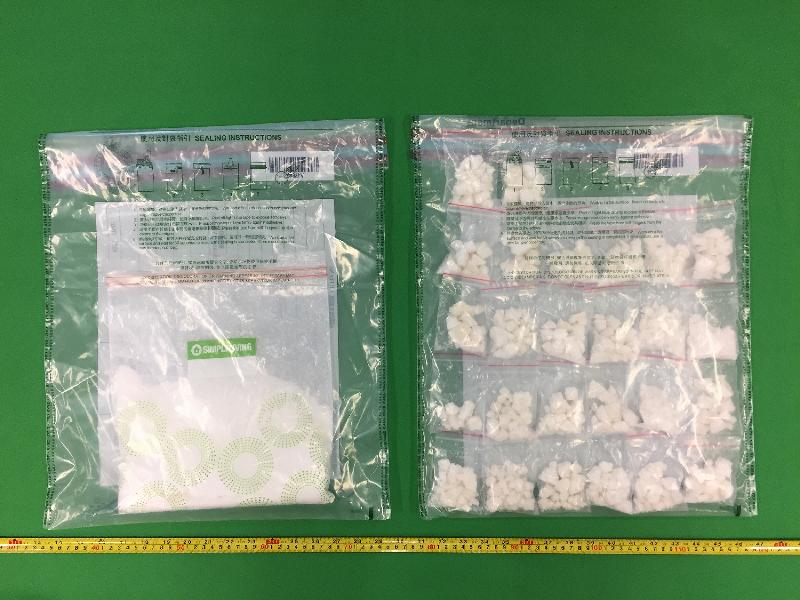 After follow-up investigation, Customs officers intercepted a man at the lobby of a residential building in Hung Hom and found about 650g of suspected crack cocaine inside a plastic bag carried by him. Customs officers then arrested the 27-year-old man. A 21-year-old man suspected to be involved in the case was further arrested in a residential unit in the same building.