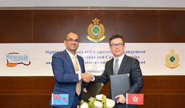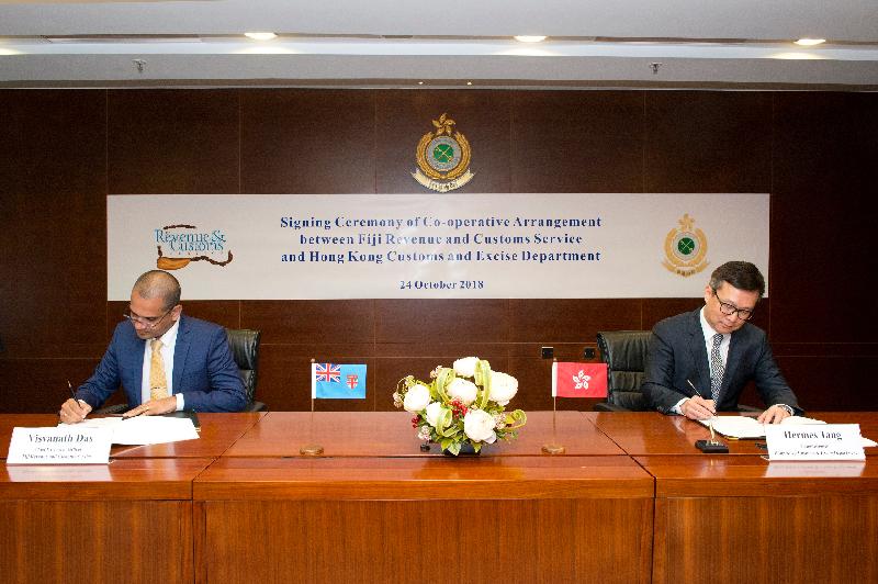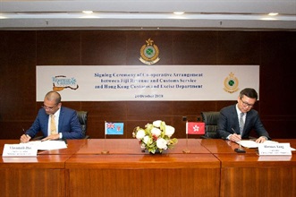 The Commissioner of Customs and Excise, Mr Hermes Tang, and the Chief Executive Officer of the Fiji Revenue and Customs Service, Mr Visvanath Das, signed the Customs Co-operative Arrangement (CCA) at the Customs Headquarters Building in Hong Kong today (October 24), with an aim of stepping up mutual co-operation in law enforcement and trade facilitation.