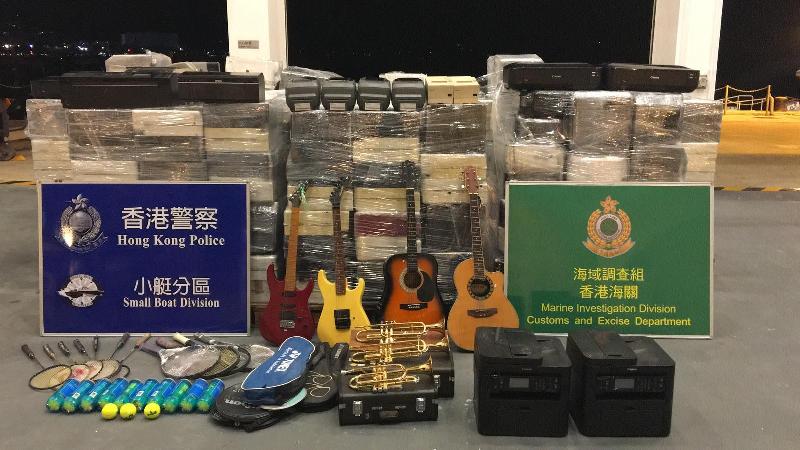 Hong Kong Customs and Marine Police today (November 7) conducted an anti-smuggling joint-operation and detected a suspected smuggling case using fishing vessel in the Southeast waters of Hong Kong. A large batch of suspected smuggled goods including office equipment, musical instruments and sports gears with an estimated market value of about $700,000 were seized.