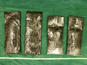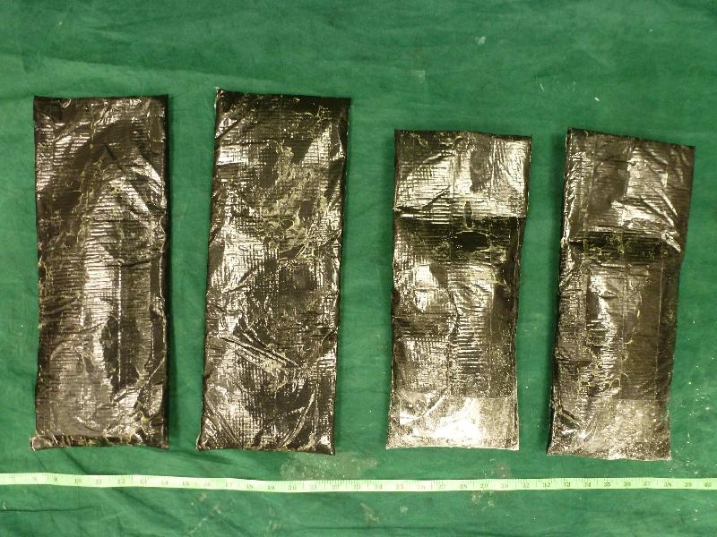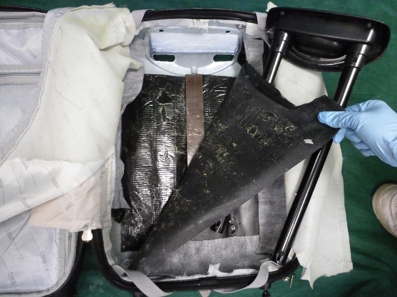 Customs officers identified and intercepted a suspicious female while patrolling at the transit area at the airport this afternoon. The female arrived from São Paulo, Brazil via Addis Ababa, Ethiopia and was going to take ferry to Macau. After emptying a suitcase of the female, Customs officers found it exceptionally heavy which aroused their attention. In-depth examination led to the discovery of four slabs of suspected cocaine concealed inside the false compartment of the suitcase.