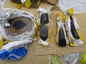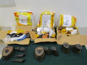 Customs officers identified the suspected express parcels at a freight delivery centre for inspection. The parcels were declared to contain "wood sample" arriving on different flights on July 26 and July 27 from Pemba, Mozambique, to Hong Kong via Johannesburg, South Africa. Upon examination, Customs officers found the 10 slabs mingled with wood products in the parcels. Each slab was wrapped in aluminium foil and plastic sheets. The 10 slabs were suspected to be cut from two whole rhino horns. It is believed that the smuggler attempted to evade Customs detection by cutting the suspected rhino horns into pieces for delivery in separate consignments.