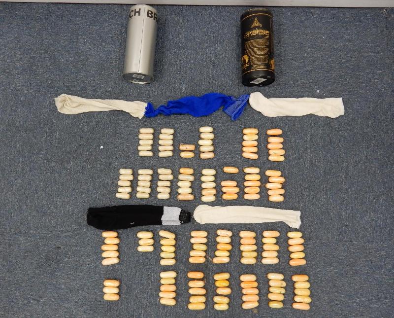 The woman arrived at Hong Kong from Entebbe, Uganda via Dubai, United Arab Emirates. Customs officers found 137 pellets of suspected cocaine, about 2.7 kilograms, contained in two metal boxes in plastic bags she carried.