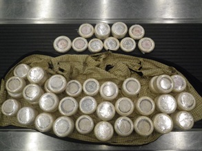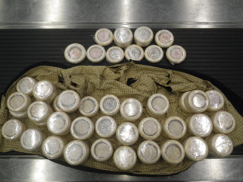 Customs officers intercepted two suspicious male passengers at the airport this morning. The two men arrived in Hong Kong from Harare, Zimbabwe, via Dubai, United Arab Emirates. During Customs clearance, Customs officers found about 19kg of suspected ivory products concealed in a tailor-made vest inside the hand luggage of the 47-year-old man. About 17kg of suspected ivory products in total were found in the hand luggage of the 29-year-old man. The cases were handed over to the Agriculture, Fisheries and Conservation Department for follow-up investigation.
